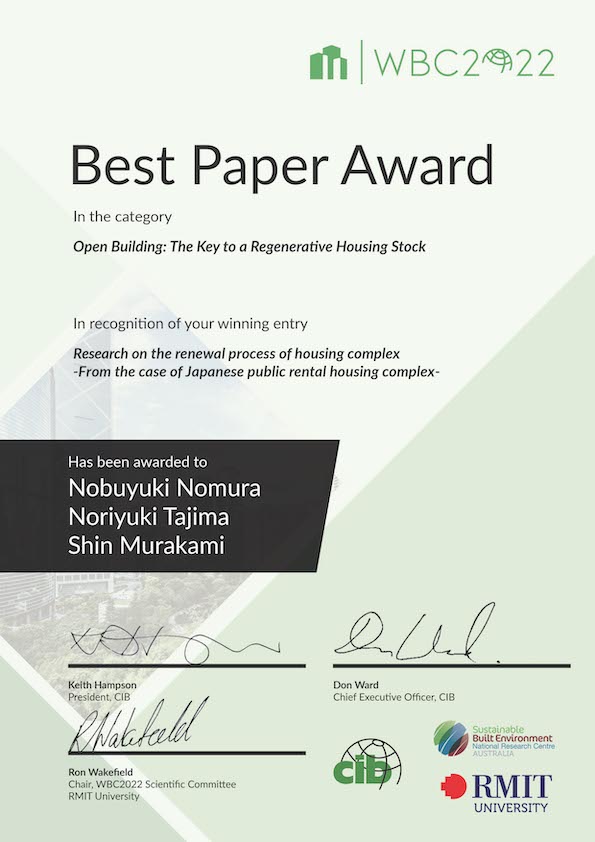 が、「オープンビルディング(再生可能な住宅ストックへの鍵)」部門において「最優秀論文賞」(Best Paper Award)を受賞いたしました。