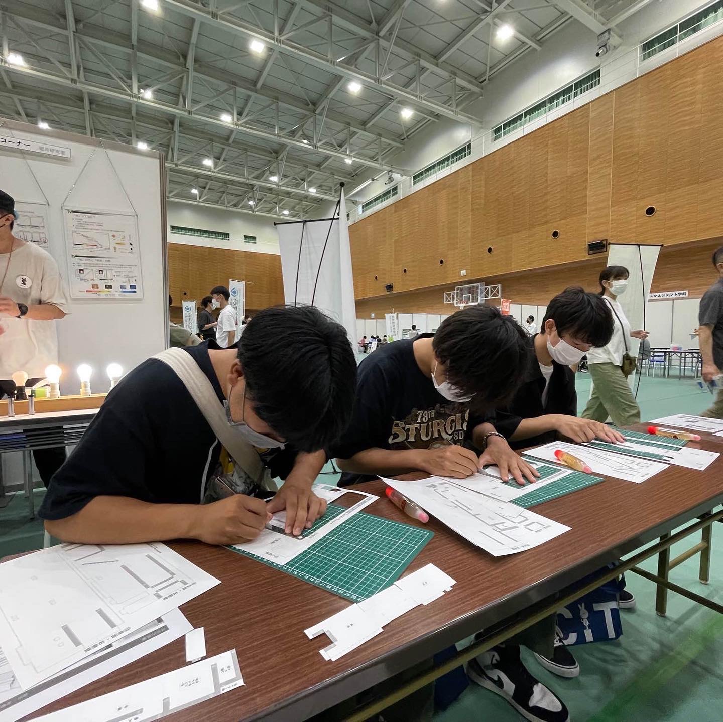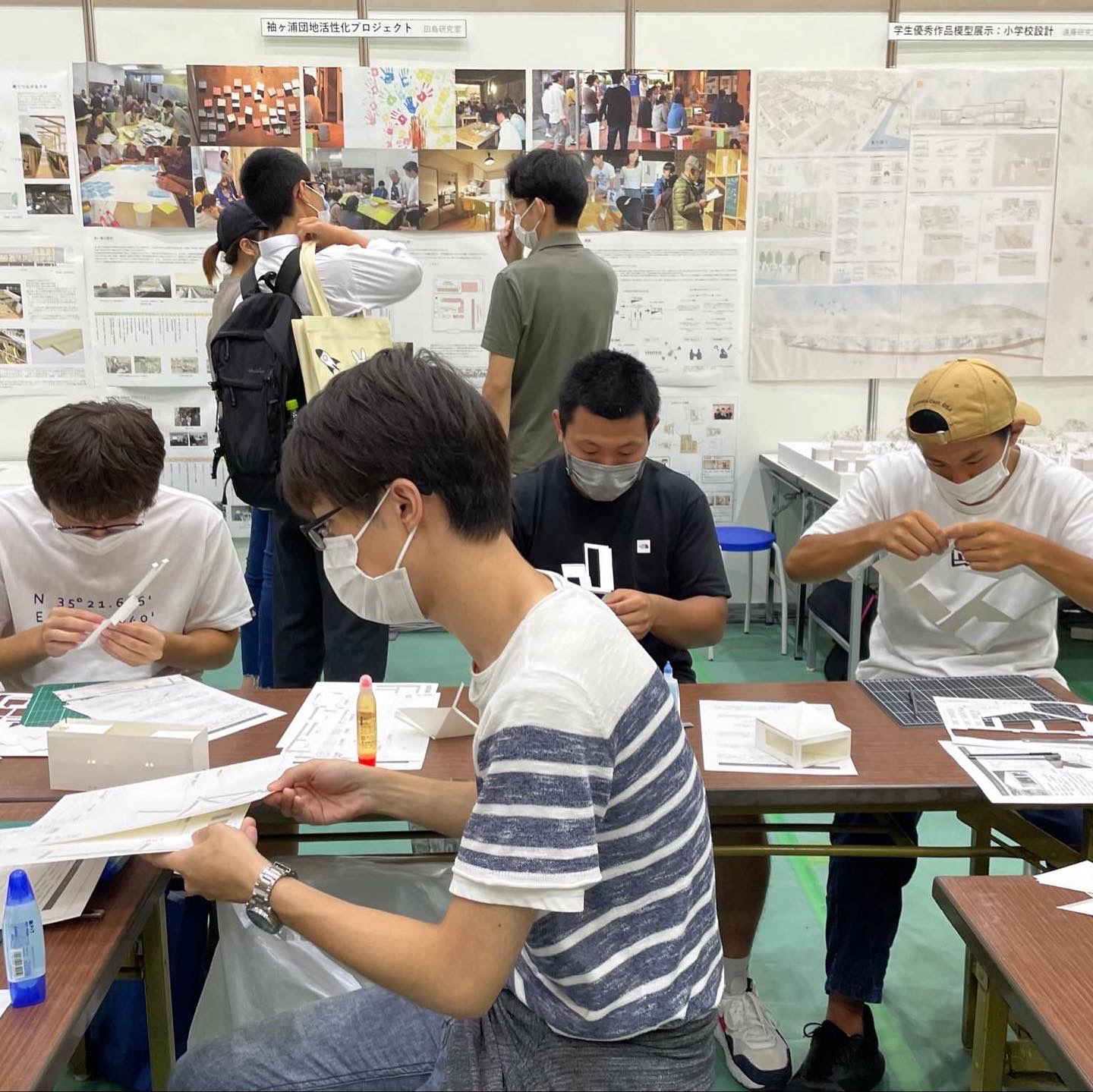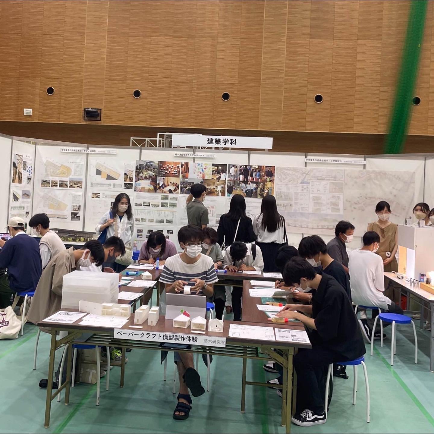 意匠系では、建築学科に興味のある高校生たちと一緒にペーパークラフト模型制作をしたり、学生優秀作品を展示しました。