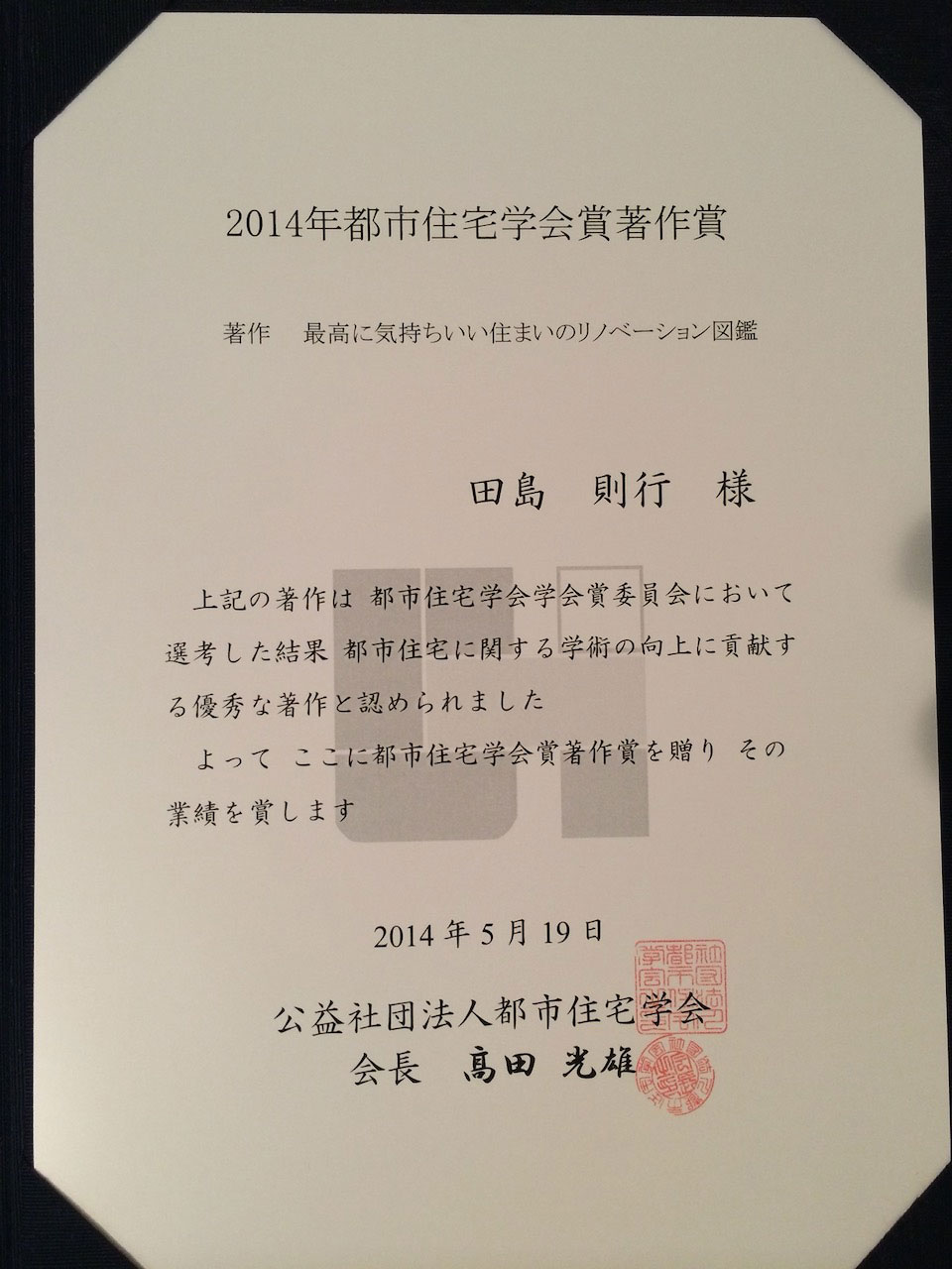 田島が共著しました「最高に気持ちいい住まいのリノベーション図鑑」が、都市住宅学会の学会賞・著作賞を受賞しました。 2014年5月19日 田島が共著しました「最高に気持ちいい住まいのリノベーション図鑑」が、都市住宅学会の学会賞・著作賞を受賞しました。