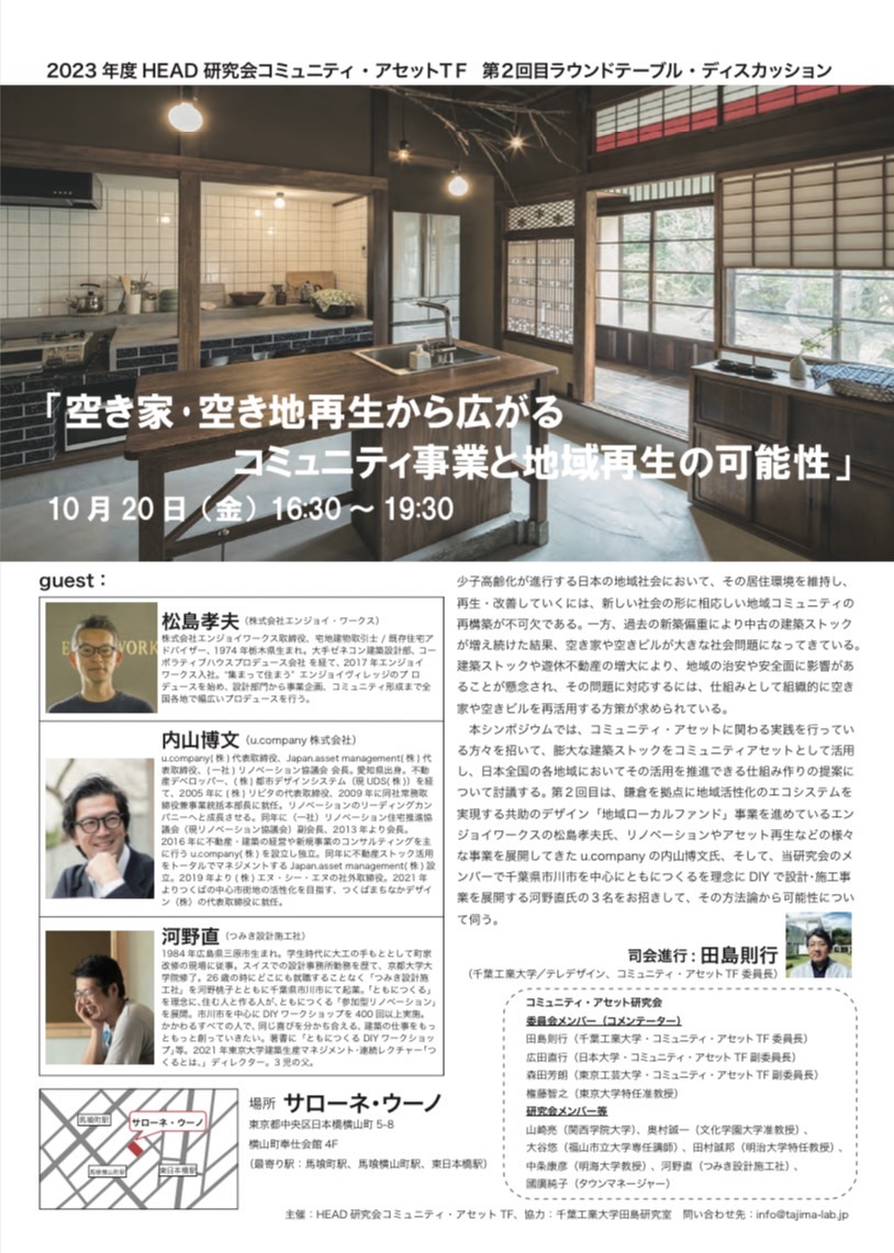 田島先生が委員長を務める、HEAD研究会コミュニティ・アセットTFの2023年第2回シンポジウムが10月20日、東京日本橋にあるサローネ・ウーノ(横山町奉仕会館4階)にて開催されました。