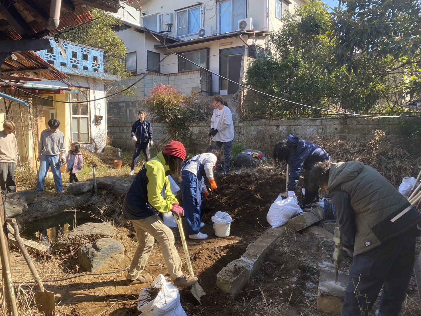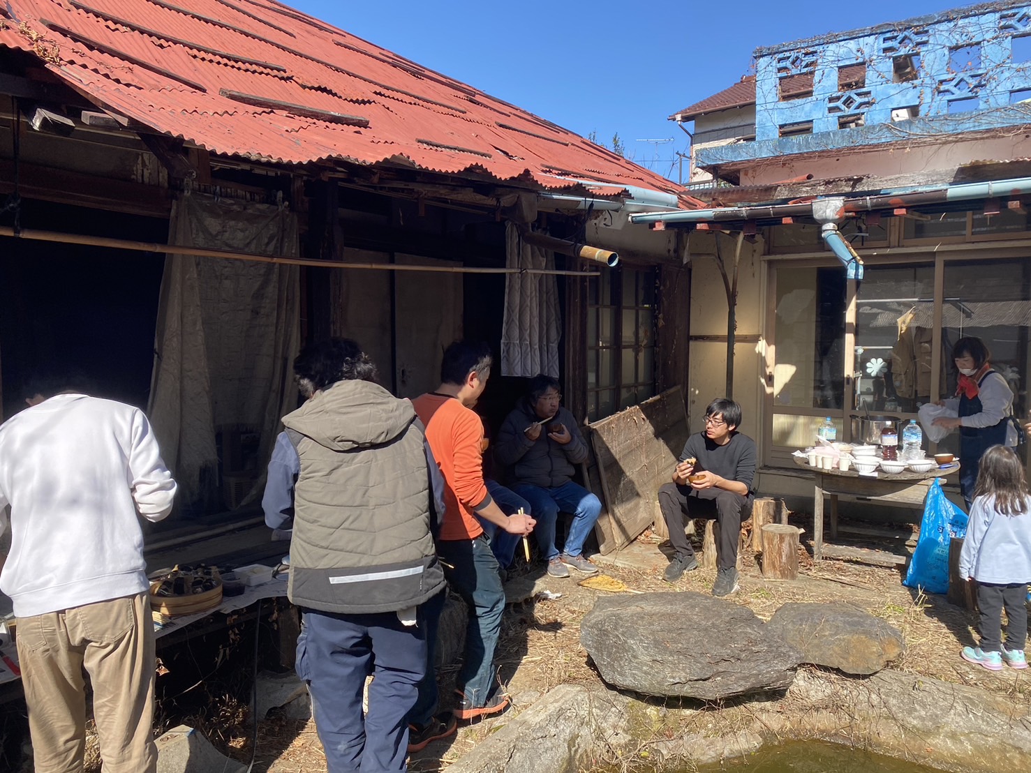 ワークショップでは敷地の奥にある広場の整地をし多く参加者の協力の元。砕石機を使いコンクリートを砕いたり、いくつもの土嚢袋や石を運び出しました。お昼には、近所のバーを経営する方がおにぎりと豚汁を作ってくださりご飯を楽しみながら、広場の使い方や今後の方針についても話しをしました。