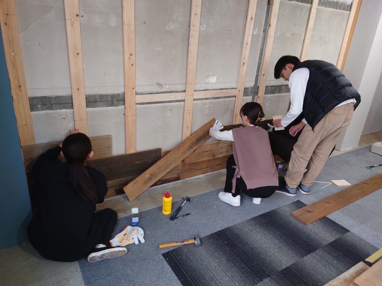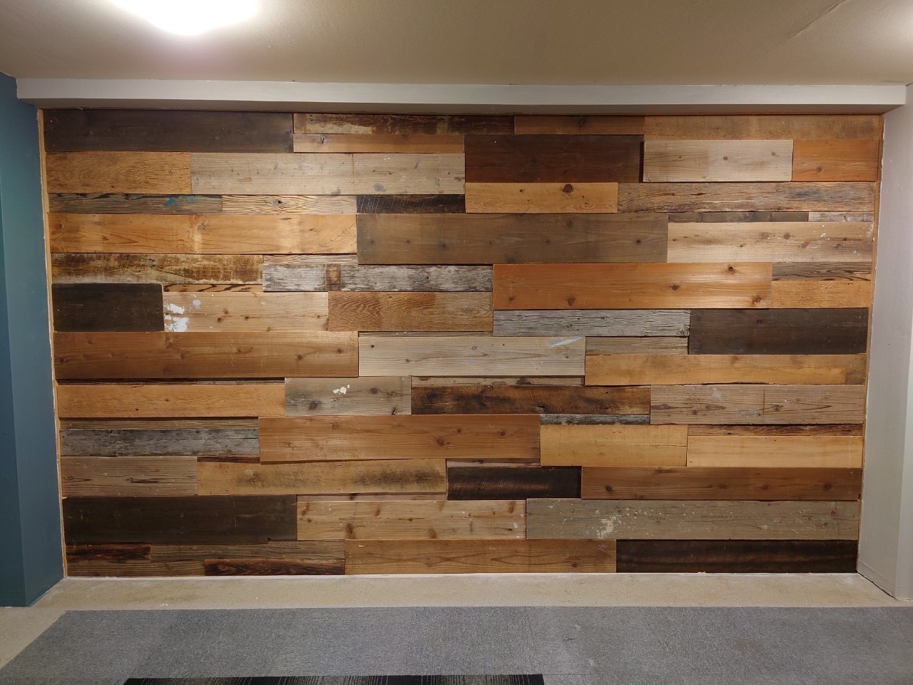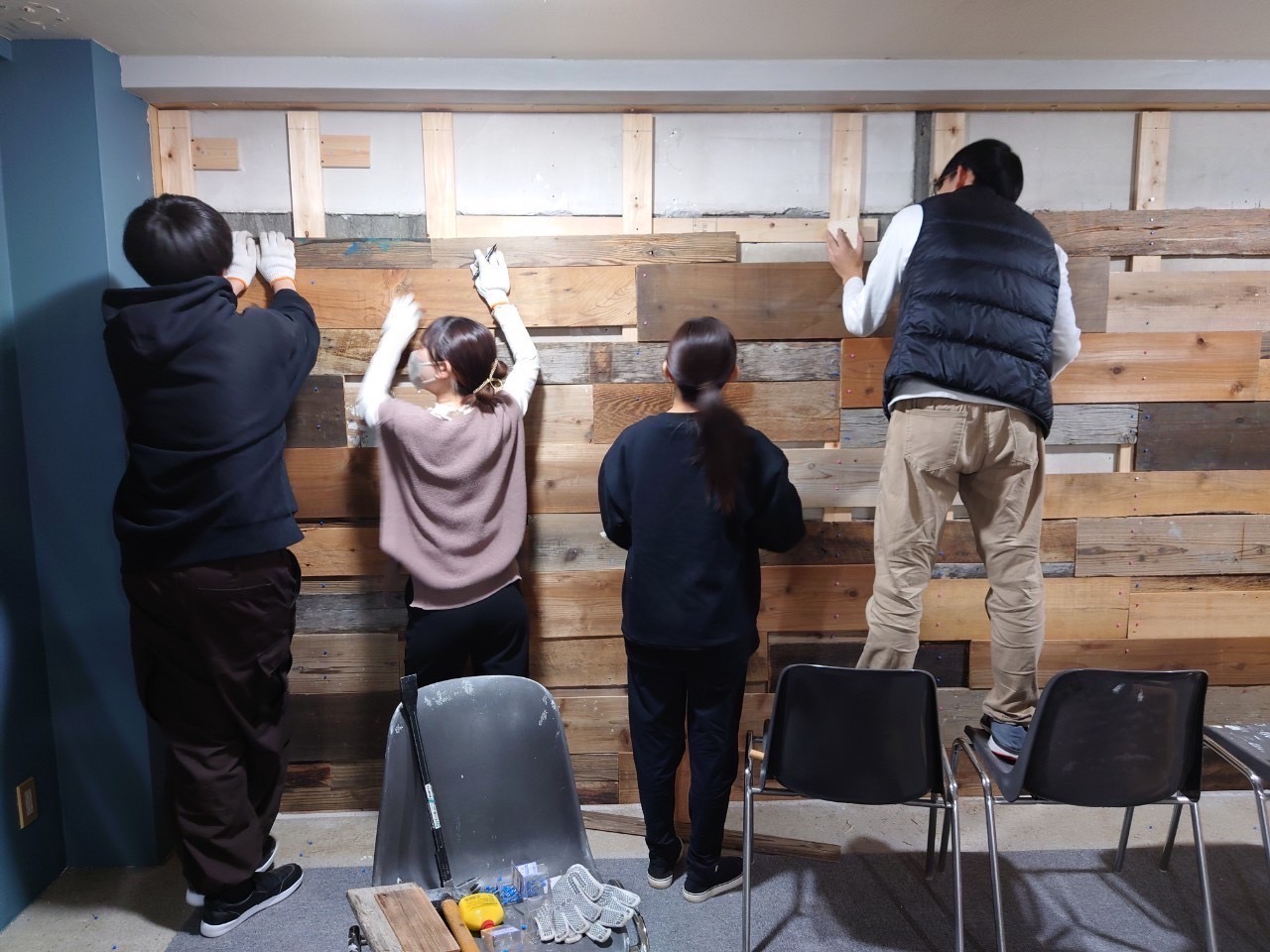 色合いのバランスや長さを調整しながら古材を貼り付け、素材感を生かしながらも落ち着いた空間となりました。