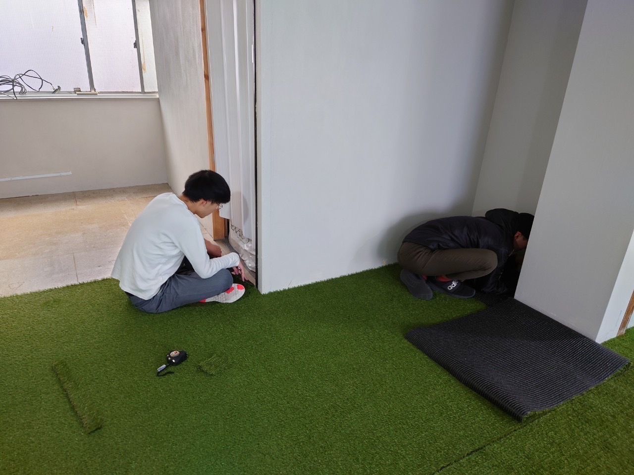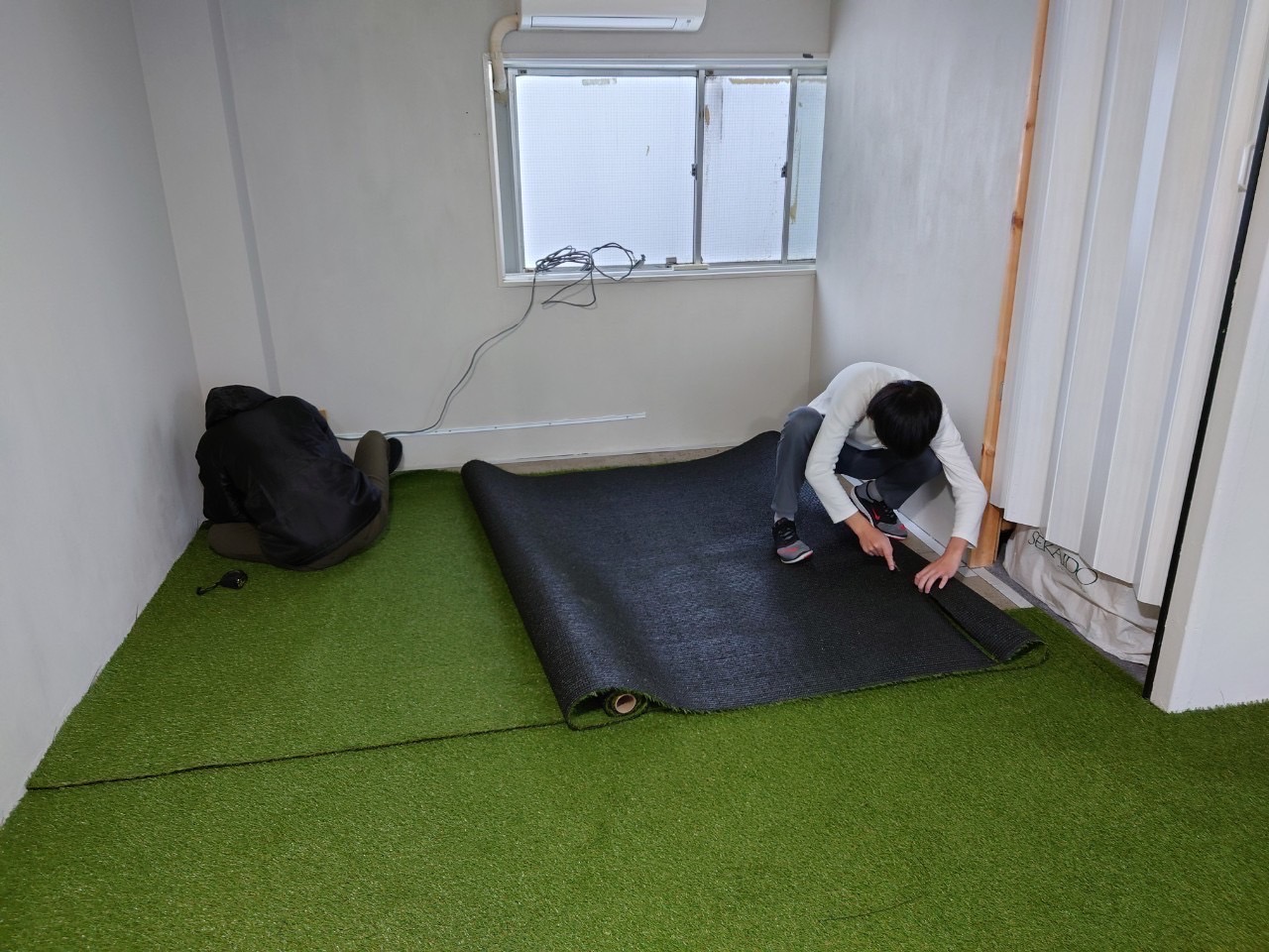 12月下旬に床に人工芝を敷く作業とマグネットパネルの取り付けを行いました。