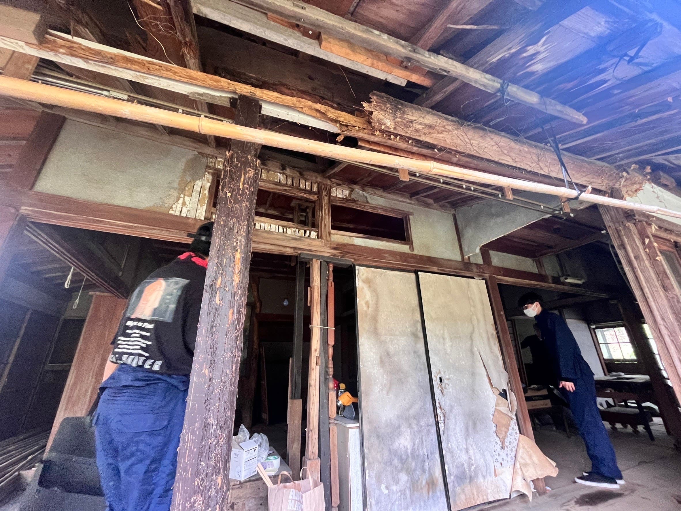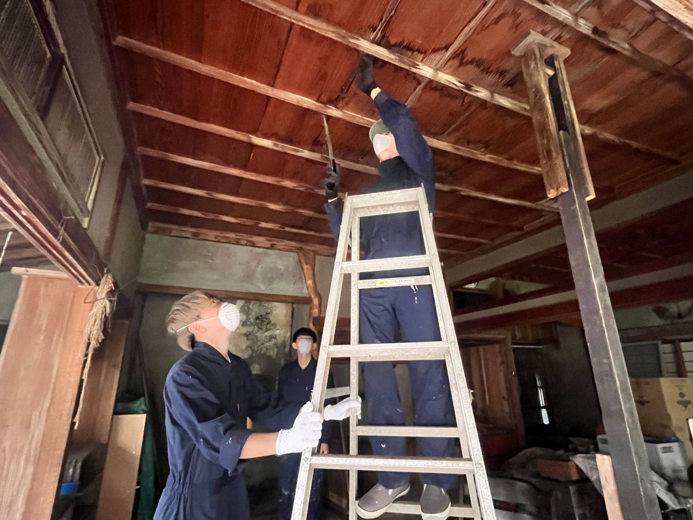5月20日に千葉県成田市にて、空き家の現状確認を行いました。A棟は何度も修復された形跡があったため、天井に穴を開け、構造体の梁や屋根下地の雨漏りによる腐食を確認しました。また屋根の上に登り、屋根材の錆や塗装が剝がれている様子などを調査し、撮影を行いました。今後は本来の状態の模型や現在の状態のスケッチを作成し、それらを比較しながら、修復方法の検討を進めていきたいと思います。