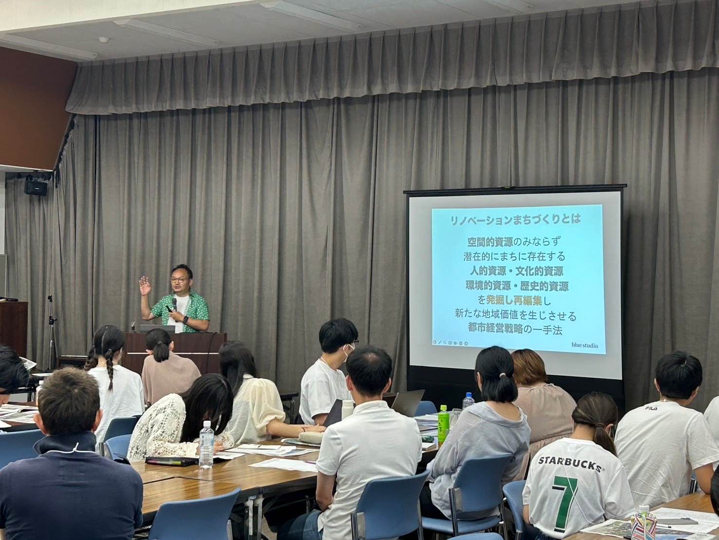 はじめに受講者の自己紹介を行いました。後半はゲスト講師によるレクチャー講演を聞き、リノベーションやまちづくりについての貴重なお話を聞く機会となりました。