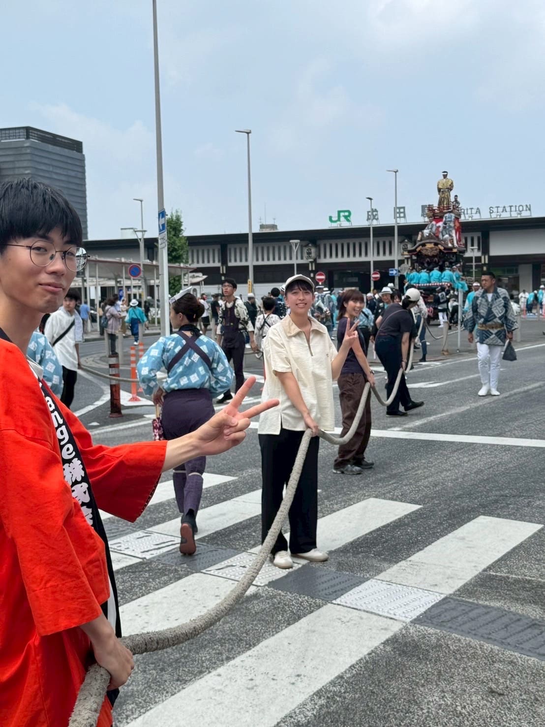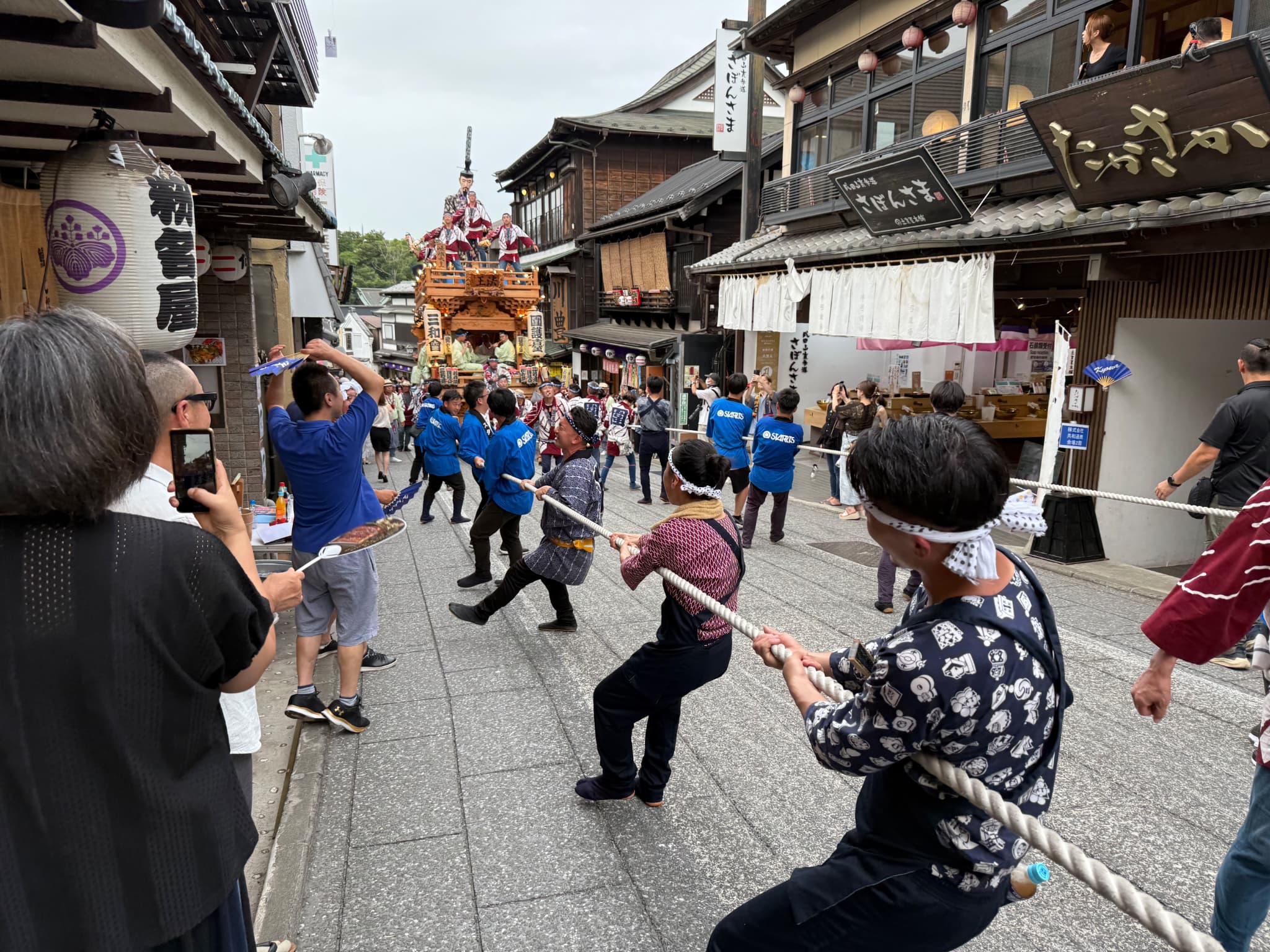 山車の引き廻しは、成田駅から新勝寺大本山にかけての表参道で行われ、斜面で山車を引くのは大変でしたが、地元の方たちの活気と山車の迫力に感動しました。